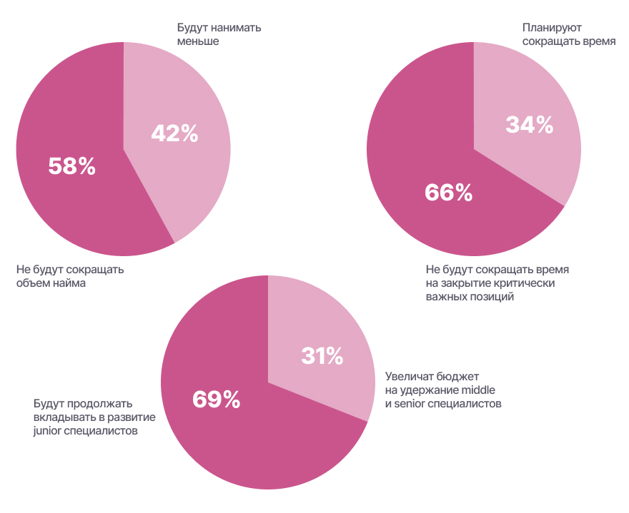 Сокращение объемов найма означает повышение требований к компетенциям соискателей. Как сообщает CFO Russia, 42% компаний-респондентов сообщили, что в 2026 году планируют нанимать меньше, чем в прошлые годы. С другой стороны, 66% респондентов отметили, что время на закрытие критически важных вакансий (лиды, архитекторы, data специалисты, инженеры безопасности, ДевОпс и т.д.) не измениться в меньшую сторону. Это значит, что идет смещение внимания в сторону более высоких компетенций кандидатов. А 31% респондентов поделились, что собираются перенаправить бюджеты на найм и обучение junior-специалистов на удержание специалистов middle/senior уровней.